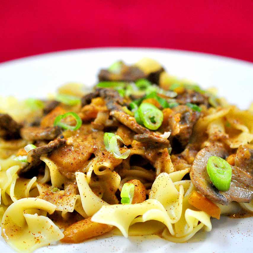 Put the noodles into bowls and top with the stew. Sprinkle a